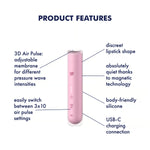 Do you remember the excitement of your first kiss your heart racing goosebumps on your skin? The First Kiss will give you the same sensation! This Air Pulse Vibrator offers a movable membrane and 10 customizable pressure wave intensities allowing you to tailor your experience from delicate caresses to passionate sensations. The closer the membrane is to the opening the more intense the stimulation. Three LED lights on the front indicate current position of the membrane so that it’s even easier for you to choose your favorite program.Compact and lipstick-shaped this vibrator fits in every handbag waiting patiently for you to use it. With its double-layer silicone surface the First Kiss feels especially gentle on your skin – just as its name implies.