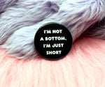 This I'm Not a Bottom, I'm Just Short Badge is 38mm in size with a push-pin back.