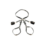 The use of your body is a gift; treat it like one with this bondage harness by Strict and wrap up your waist thighs and wrists like a nice little package it even has bows included! Made from durable PU faux leather it is vegan friendly and easy to spot clean or wipe clean after each use. The wrist cuffs close using nickel-free gold coloured metal buckles. Adjust the buckles on the thigh straps waist strap and wrist cuffs for a custom and comfortable fit. Accentuate your curves and make your partner drool with lust and desire as you present yourself as the object of their admiration a bound and submissive playmate ready to spice up the night!Waist adjusts from 35 inch to 52 inch circumference.Thighs adjust from 21.5 inch to 37.5 inch circumference.Wrist cuffs adjust from 5.75 inch to 10.25 inch circumference.