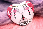 These badges are heart shaped with a clear glossy finish. 55mm x 55mm, hand-made in the UK.