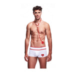 Doctor Love is here to tend to all your needs! This two piece playful and super sexy costume features a low rise short boxer/brief designed in the classic white and red while the matching red stethoscope completes the look for the ultimate fantasy!