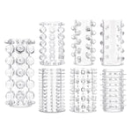 Me you Us Sensational Seven textured sleeves add extra intensity to your pleasure. These sleeves can be worn on the penis shaft or on a vibrator adding an extra layer of sensation where it counts. This selection of seven sleeves offers incredible variety. You can choose from spikes nubs dots bumps and more for personalised pleasure. These sleeves are super stretchy and are easy to pull onto your shaft or your vibrator. They are latex and phthalate free for safe regular play. These sleeves are waterproof for play beyond the bedroom - use them with a waterproof vibrator in the bath or the shower. The largest of these sleeves measures 6.75cm in length while the smallest measures 4.5cm. They can be used with a water based lubricant. These sleeves are an easy way to add extra sensation when you play - they’re great for couples pleasure and solo fun.
